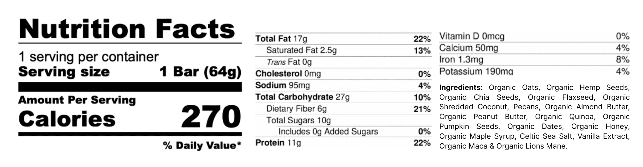 *Organic Oats *Organic Hemp Seeds *Organic Flax Seeds *Organic Chia Seeds *Organic Peanut Butter *Organic Almond Butter *Organic Quinoa *Organic Dates *Organic Raw Honey, *Organic Maple Syrup *Organic Coconut *Organic Lion's Mane *Organic Maca, Pecans *Organic pumpkin Seeds Celtic Sea Salt