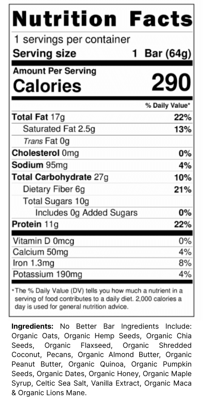 At No Better Bar, we keep it simple — every ingredient has a purpose. Our bars are made with real, whole foods like organic oats, natural nut butters, nuts, seeds, raw honey and dates. No added sugars, no artificial flavors, preservatives, or fillers — just clean fuel your body can actually recognize and use. All ingredients are gluten-free, though the bars are not made in a certified gluten-free kitchen. Each bar delivers 11 grams of protein naturally from nuts and seeds to keep you energized and satisfied, whether you’re powering through a workout, a busy workday, or a weekend adventure. It’s the perfect balance of taste, texture, and nourishment — because there’s truly no better bar.